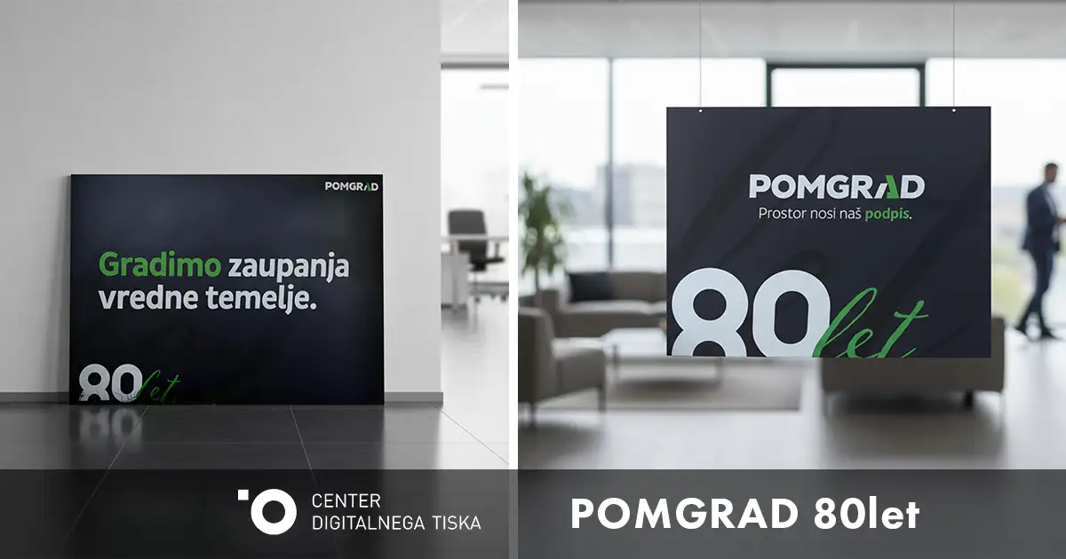 Projekt je bil usmerjen v poudarjanje vrednot, identitete in pomembnega mejnika – 80-letnice delovanja podjetja Pomgrad. Rešitev temelji na čistem, umirjenem dizajnu, kjer grafika ne tekmuje s prostorom, temveč ga dopolnjuje. Kakovosten tisk in natančna izvedba omogočata, da panoji delujejo profesionalno, hkrati pa dovolj subtilno, da ne preglasijo arhitekture prostora.