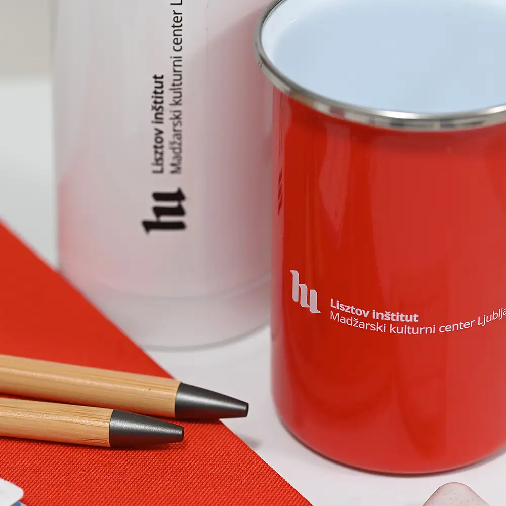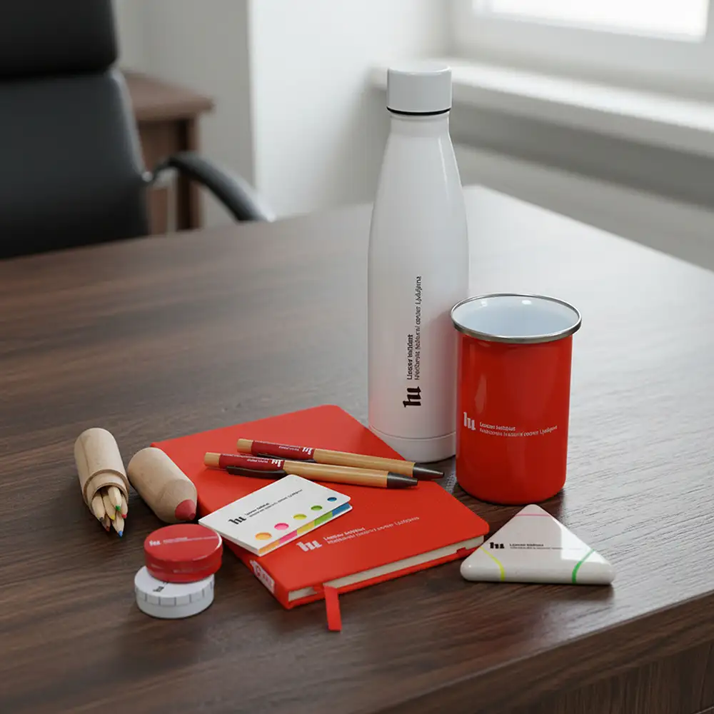 Seveda. Pripravimo lahko celoten set darilnih artiklov – od steklenic in lončkov do beležk, svinčnikov in drobnih pripomočkov – vsi z enotnim logotipom ali grafiko naročnika.