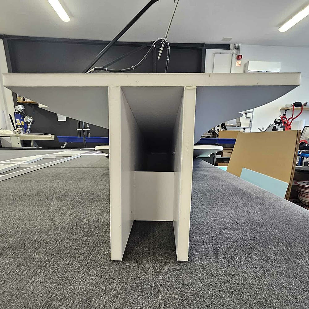 V fazi načrtovanja smo se osredotočili na razmerje med višino, širino in debelino materiala ter na stabilnost celotne oblike. Konstrukcija je bila zasnovana tako, da ploščni material sam prevzame nosilno funkcijo, brez kovinskih ali lesenih podkonstrukcij. Posebna pozornost je bila namenjena težišču in togosti, saj gre za izložbeno postavitev z vidnih vseh strani.