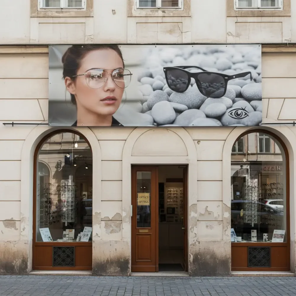 Za Optiko Flajšaker smo izdelali velikoformatni UV tisk neposredno na alu dibond ploščo, ki v celoti zapira izložbeno površino in hkrati deluje kot močan vizualni element.
