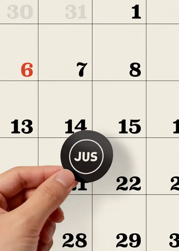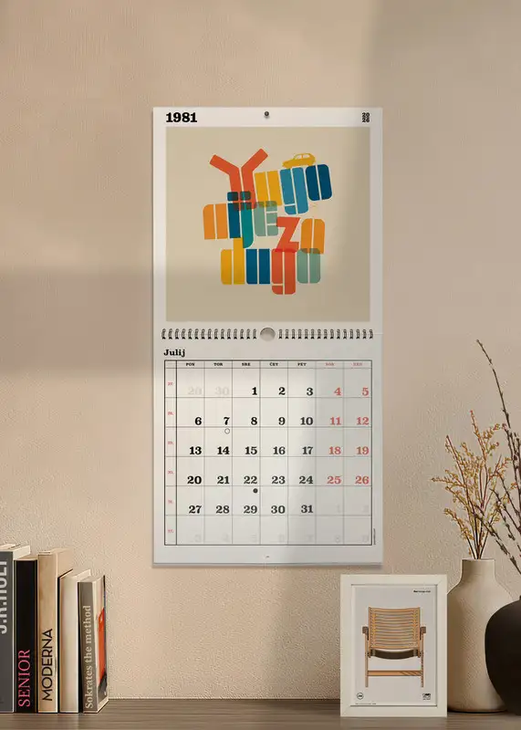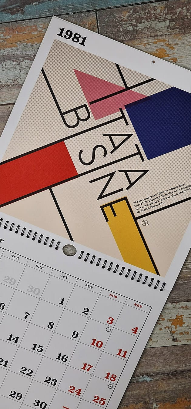 Stenski koledar JUS – Naprej v preteklost je oblikovni projekt, ki leto 2026 postavi v dialog z letom 1981 – letom, ki ima identično razporeditev dni. Prav ta časovna skladnost je izhodišče koledarja, v katerem vsak mesec zaživi z močnim, prepoznavnim citatom iz obdobja, ko so nastajali kultni izrazi in kultne fraze, ki so danes del kolektivnega spomina. Vizualni del je zasnovan v duhu klasičnih likovnih tehnik, kar koledarju daje poseben retro značaj.